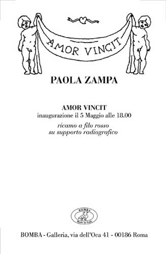 Il ciclo di opere raccolte sotto il titolo “AMOR VINCIT”, rappresenta l’ultima produzione di Paola Zampa (2003-2004). La tecnica – ricamo a filo rosso – riconduce i lavori a una pratica domestica, femminile, tradizionalmente rivolta a ornare oggetti di uso quotidiano e a rappresentare immagini piacevoli e graziose. Il supporto – radiografie di parti del corpo umano – introduce una drammaticità che affiora in controluce e richiama il tema della “totentanz”. L’amore per la bellezza, in tutte le sue forme, tenta un esorcismo nei confronti della precarietà della condizione umana. Temi ingenui e ironici – nanetti, olandesine, scene agresti – rimandano a un’iconografica popolare, tipica di alcune regioni dell’Europa centro-settentrionale. Temi “alti”, ripresi dalla grande produzione pittorica del XVI e XVII secolo, sono riproposti come icone di una bellezza senza tempo. Figure mitologiche di esseri semidivini celebrano una vitalità capace di trascendere la morte.
