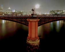 The next series of images depict night-time scenes in the City of London where artificial illumination creates saturated colour and heightens the sense contemporaneity, here even the moon appears as a neon streak. At the same time the photos relate strongly to 19th Century photographers' preoccupations with scenes of industrial advance. Pictures of classic, Victorian, massively engineered structures, such as Blackfriar's railway bridge spanning the river, are shown along side images of The City¹s burgeoning high-rise architecture. In Riddy's version London appears almost weightless, distanced but somehow not unfamiliar, it is a place of where incongruity produces instances of surprising beauty and enjoyment. The landscapes of South Africa are the subject of the works on show in the basement galleries. These desolate places have an almost mythical air often evoking biblical landscapes from early renaissance painting. A view across the sea from The Cape feels as if it has never been witnessed by humans with its hazy horizon and rainbows dissolving into mist and light. The pictures of the small Afrikaans settlements and their iconic religious architecture both compliment and throw into stark contrast the surrounding primal landscapes. The two final works in the exhibition are concerned with spatial structure - the composition of the images seems to hold the viewer at bay at the same time there is a very tangible sense of the parallel time zones - of the world within the frame of the photograph and that of the present. *** John Riddy was born in 1959. He studied at Chelsea School of Art. His work has been exhibited widely both in Britain and abroad, recent exhibitions include 100 Great Photographs, Dean Gallery, Edinburgh, Cathedral and Camera, Baltic, Newcastle (2003). His large-scale photographic installation of Room 101 can be seen currently at the Victoria and Albert Museum, London.