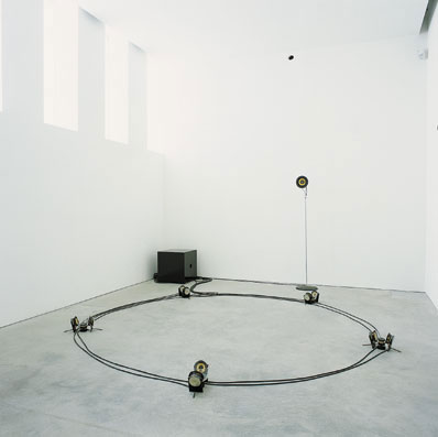 Marianne, made in collaboration with Paolo Lavazza, is a sound installation, formed by 5 pairs of speakers that lie in a circle on the floor, linked by black electrical wire, each containing 1 quartz bowl. The bowls emit a hypnotic sound that seems to move around the room, they have a pentatonic tonal scale and each plays a single note (C, E, G, B flat, C). The speakers are set in counter phase, in a configuration called push/pull - this makes the quartz oscillate and produce autonomously audible frequencies. Moreover, this configuration creates an alteration in the directional perception of the sound. The result is a circularity of sound events that progressively form a single, vibrant matrix in which the listener is enveloped and captured. The hypnotic character of the work is stressed by a voice occasionally counting from 1 to 20 and back from 20 to 1, evoking the entrance and exit from hypnosis.