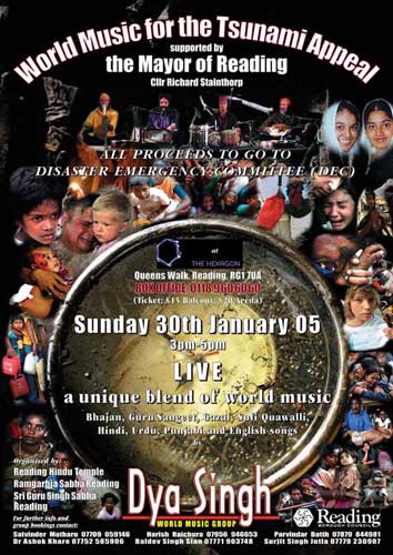 All proceeds to go to Disaster Emergency Committee (DEC) Brothers, Sisters and friends please help, to promote & support this one of special concert for a, such a worthy cause. By buying tickets, You will not only be helping to raise money (every penny) in return you will also experience a unique blend of world music, Guru sangeet, Bhajan, Gazal, Sufi Quawalli, Punjabi and English 2 hours live concert. The Hexagon Theatre, Reading, RG1 7UA. Ticket Box-office 0118 9606060)