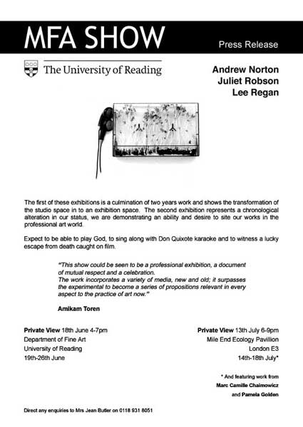 University of Reading MFA graduate shows featuring Marc Camille Chaimowicz and Pamela Golden.