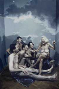 White Space Gallery is pleased to present the works of Tatiana Antoshina, one of the most challenging and provocative of woman artists working in Russia today. Antoshina is an artist who actively explores and playfully subverts gender roles in her art practice and this will be the first London exhibition of these works. The exhibition will include the photographic series Museum of a Woman, a parodic view of classical paintings, alongside her porcelain portraits/sculptures which were featured in After the Wall (Moderna Museet, 1998) and depict the Russian performance artists, Alexander Brenner and Oleg Kulik. The highlight of this exhibition will be her new photographic series Europe (2002/4) in which among other images, Europe is portrayed as a nude elderly woman breast-feeding the infamous cloned sheep Dolly. Antoshina's Museum of a Woman is as much a reaction to the newfound Russian democracy as to the persistence of ‘artistic’ boy’s clubs, despite the increasing recognition of a history of great woman artists from Russia inside and outside the country. Antoshina's identity as an artist is based on a critical awareness of her position as a woman artist in this situation. Antoshina depicts Woman, who is usually considered the sexual object of a male gaze, as a remodelled form of active subject, reversing the roles normally assigned to women in classical works. Instead of the female nudes pictured by Ingres in his Turkish baths, Antoshina represents an ensemble of seductive naked men. Similarly, in her new project Europe, she is portraying a group of young men sitting in homage to an elderly woman, whose body and actions reveal her authority, dignity and experience. The model for these works is Pani Bronya, aged 73. In her new works, Bronya's elderly nude figure becomes a mythic representation for an ageing Europe, where today the proportion of elderly people in the population is increasing despite society's apparent fear of ageing and its fascination with youth. In her similarly ‘ironic monuments to Kulik and Brenner’ Antoshina freezes their ephemeral and radical performance acts in the traditional technique of porcelain, a medium over-identified with applied female crafts. This is typical of Antoshina’s use of varying media and materials and knowingly references both Jeff Koons and Judy Chicago's use of the same media, while offering her own very unique monuments to Russia's art history. Tatiana Antoshina