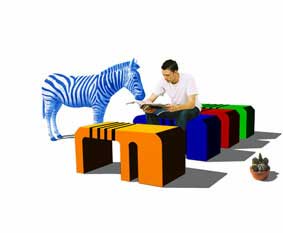 Welsh C herd/cenfaint723+b This piece was designed for Lacoste through the Pentland Design and Furniture Competition. The concept behind the idea of a blue zebra comes from more than one source. The most obvious one is using the zebra because in the wild it is the prey of the alligator (Lacoste¹s distinctive logo). This natural behaviour is what led me to decide the zebra to be in a drinking position. The blue colour comes from the coolness of the water and Lacoste¹s prominent use of colours. Through only colouring one zebra, the uniqueness of Lacoste is represented and shown to stand out of the herd.