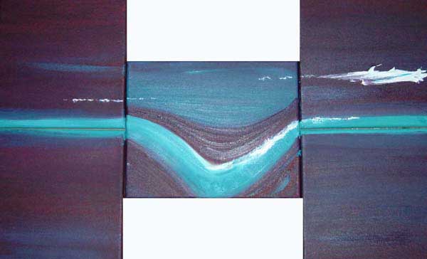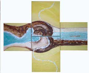 is my current favorite! Crossing Back - oil on canvas, 2004. The painting is set on four seperate canvases and then brought together as one painting. The colours in this painting reminds me of Italy so I have named it 'RustEffect' ! I would use three S to describe this painting....Sensual, Sexy and Surreal! No need for framing, can use spaces between each square to add your own touch of style and blend the painting with the colour of your own wall! Please ignore the white/grey area around the image on screen. Each canvas square size individually: Left and right square(s) 20 x 20 cm and the two square(s) in the middle 20 x 25 cm.