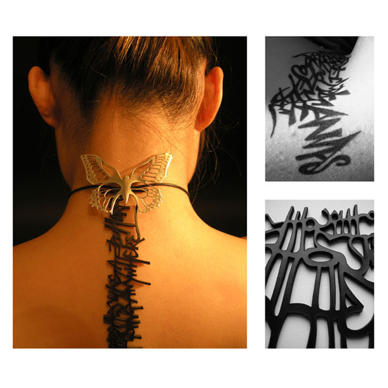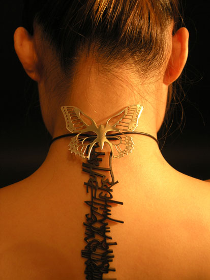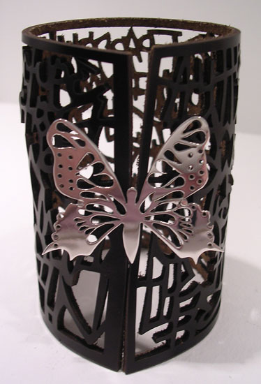 Artist Statement Central Saint Martins Graduate Laura Bezant takes cult references such as Manga illustration, graffiti and Peter Greenaway’s film ‘The Pillow Book’ and transposes them into covetable jewellery. She juxtaposes words laser cut from leather with hand pierced silver butterflies to create designs that are edgy yet feminine. Pieces like her back necklace – a long essay of love draped over the spine - and her cuffs are delicate and modern without being prohibitively conceptual. Text taken from Time Out London’s November Issue - ‘Designer To Watch’. An experienced Jewellery and Accessories designer, having worked on live projects with companies such as Cartier, Links London and Cool Diamonds during her time at St Martins, Laura has now chosen to concentrate on her own original designs. A specialist in working with precious metals, stones and leather, she uses CAD and traditional skills to create beautiful and contemporary work. |