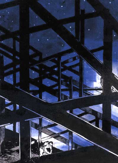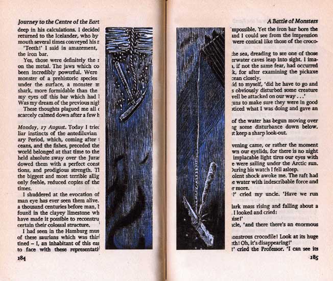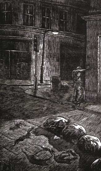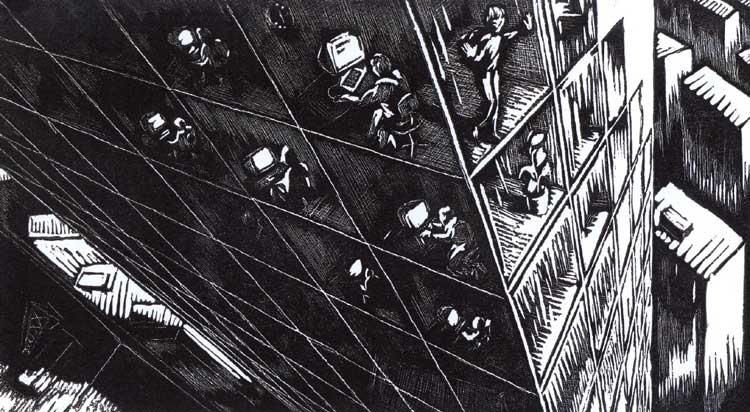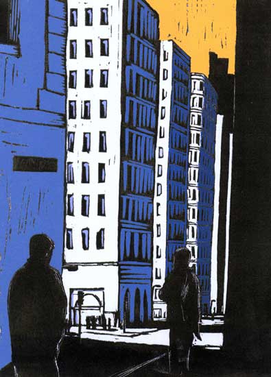 Artist Statement: "London" (Linocut) - From a set of 7 - early experiments in the medium inspired by Masereel's story's without words. "The Uni" (1,2,3 Linocut) - From a series of 21 prints Illustrating a students take on Frans Masereel's "The City", inspired by my own experiences as well as the cliches of student life (though I decline to reveal which is which). City Images (1,3 Linocut, 2 Pen and ink roller) - From a set of 7 self-promotional postcards. "Journey to the Centre of the Earth" (1,2,3,4 Linocut) - From a series of 42 decorative images punctuating the text of the Jules Verne novel (University Module)